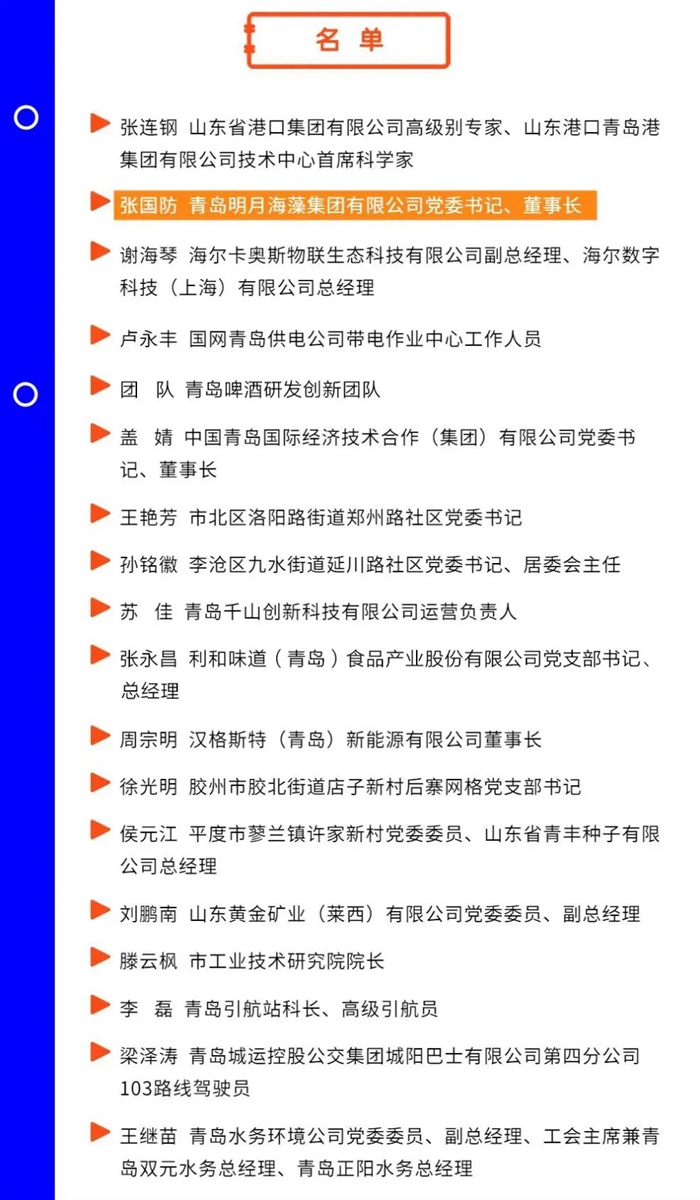 按照省委組織部部署,圍繞“十大創(chuàng)新”工作重點,青島市從4月份啟動了2022年“發(fā)現榜樣”活動,全市擬確定“創(chuàng)新榜樣”團隊2個、黨員20名。7月12日,青島市“創(chuàng)新榜樣”名單公示,其中,青島明月海藻集團董事局主席張國防入選。